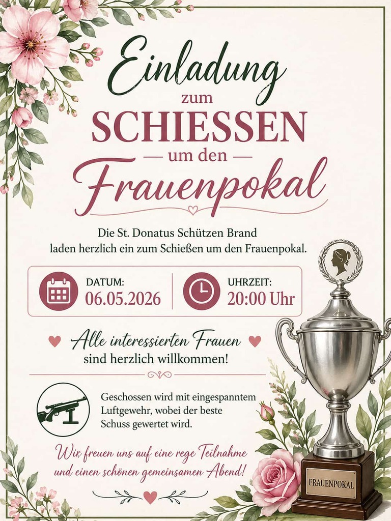 Alle interessierten Frauen sind am 06. Mai herzlich willkommen. Sie werden sich an diesem Tag im Schießen mit dem Luftgewehr messen. Der Frauenpokal wird nach dem besten Schuss vergeben.